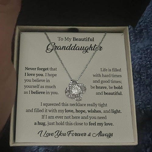 Imagine her reaction when she opens this stunning gift. Give your granddaughter a sparkling reminder that she's braver, stronger, and more loved than she'll ever know. The elegant love knot design symbolizes your unbreakable bond, paired with an empowering message that lifts her up whenever life feels heavy. Perfect for birthdays, graduation, holidays, or just because you want her to know how deeply she's loved.